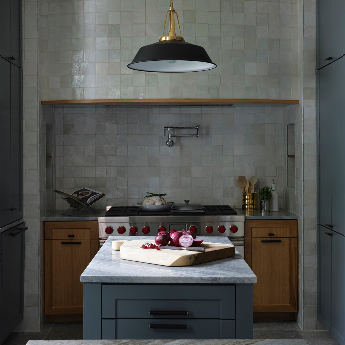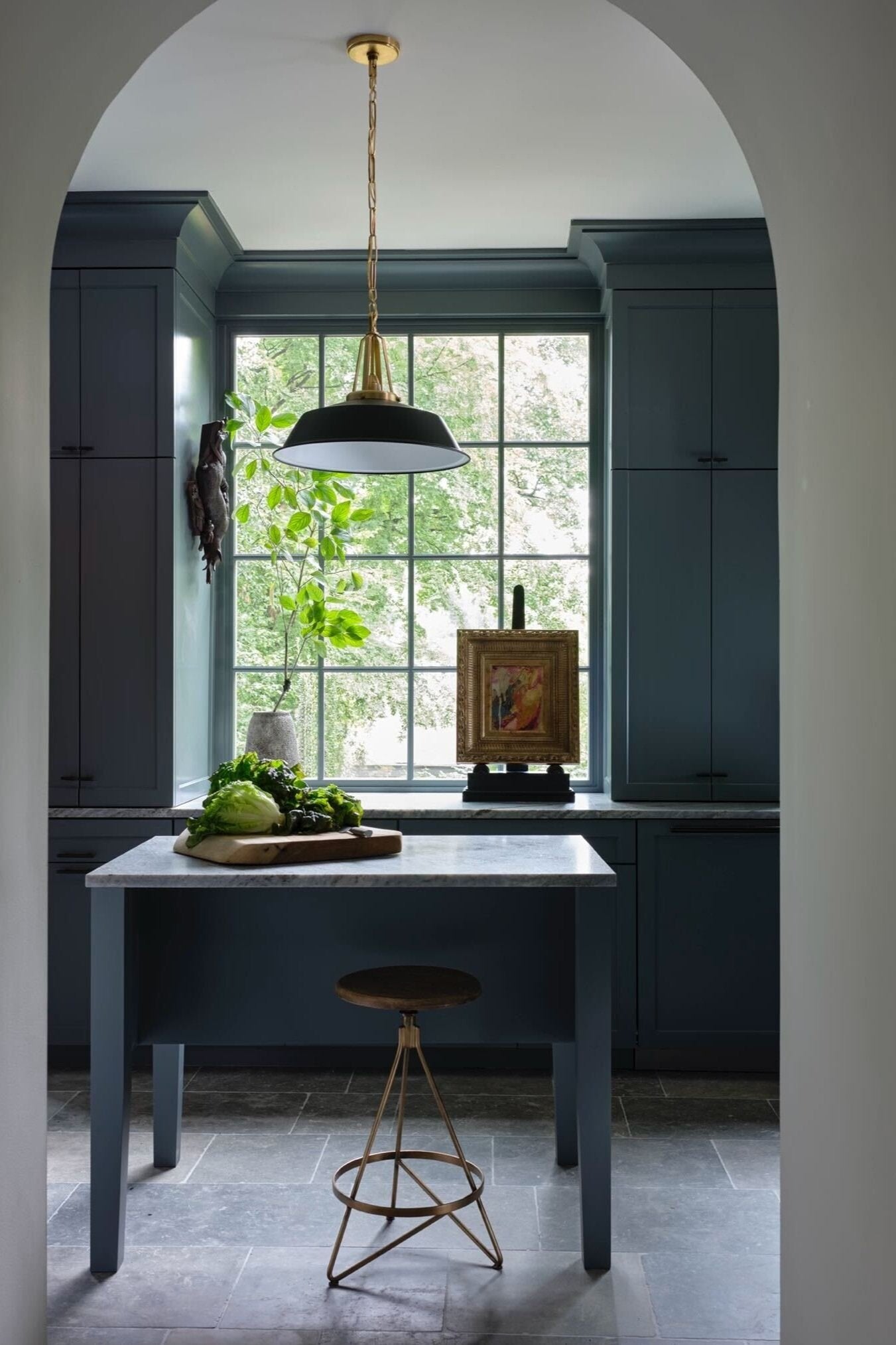This kitchen allowed us to explore the core of what we do. We aim to meet at the intersection of form and function - allowing our clients to utilize every part of a space while surrounded by the unexpected beauty of color and the idiosyncrasies of raw materials. Renovating a home built in 1903 required that we match the incredible historic craftsmanship while updating it to fit the needs of a modern family. To maximize the utility of a professional chef, we designed two custom islands. The flexibility of the layout allows the space to effortlessly transition throughout its uses as a kitchen and as a hub for an active family. Increasing the light within the space was a top priority. We moved the entrance to the kitchen, and arched the doorway, to align with the front door - creating beautiful sight lines and a steady stream of light.