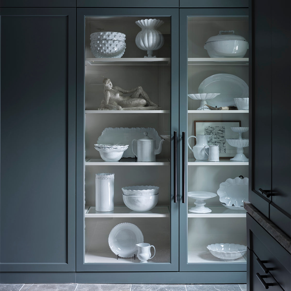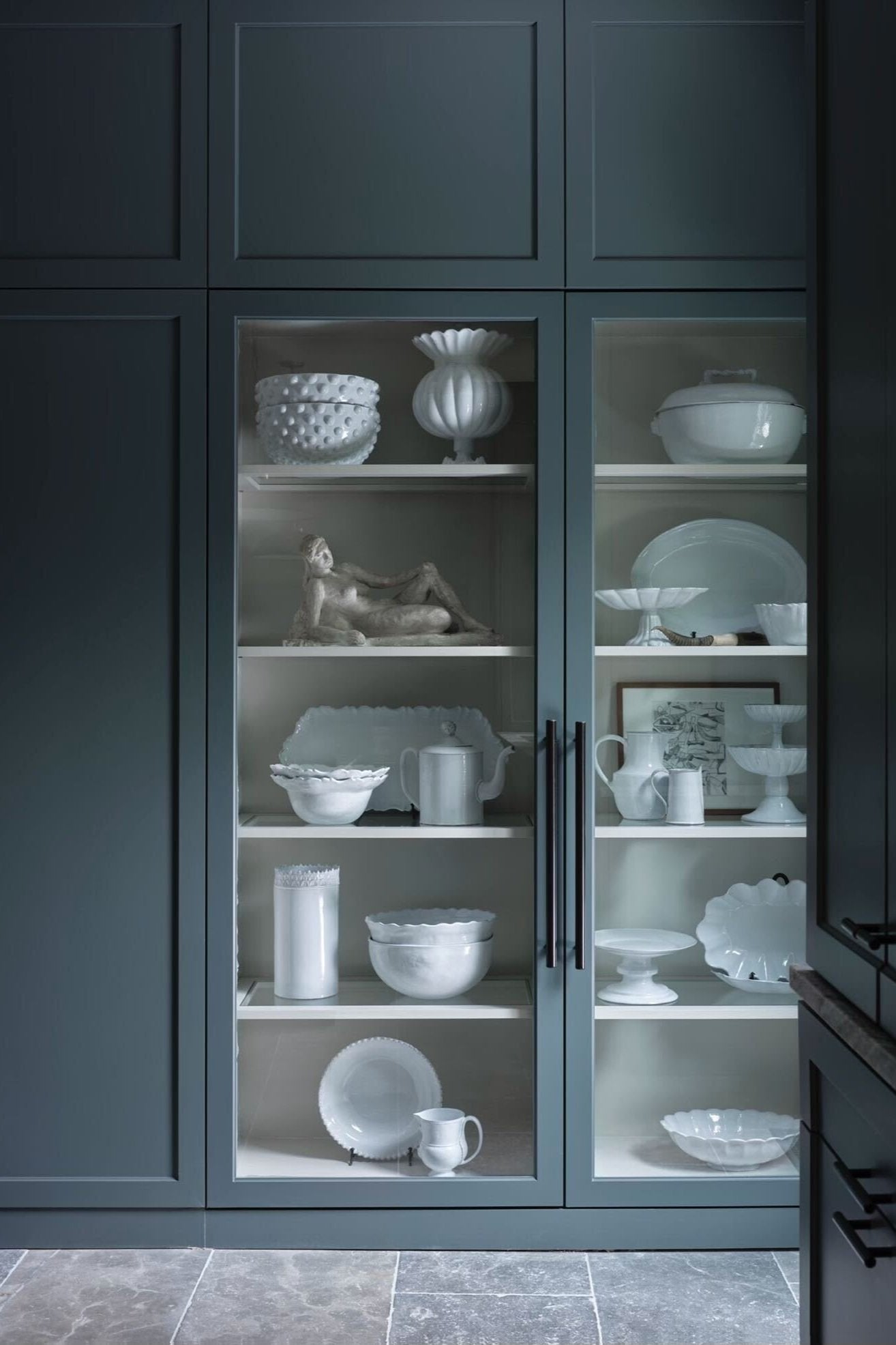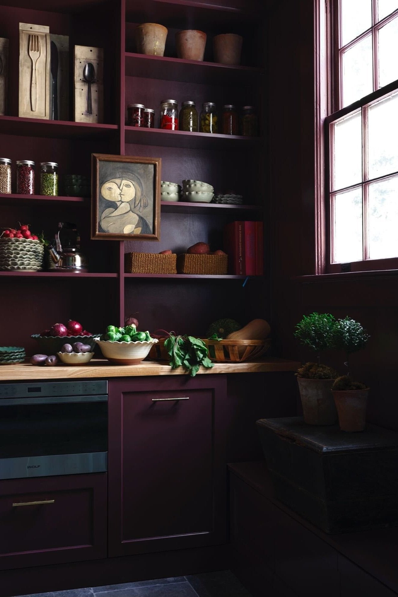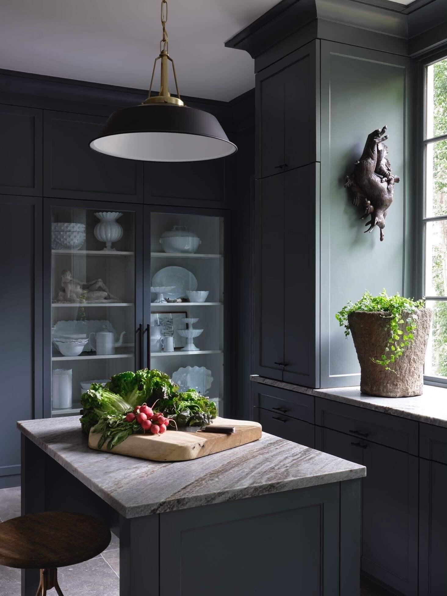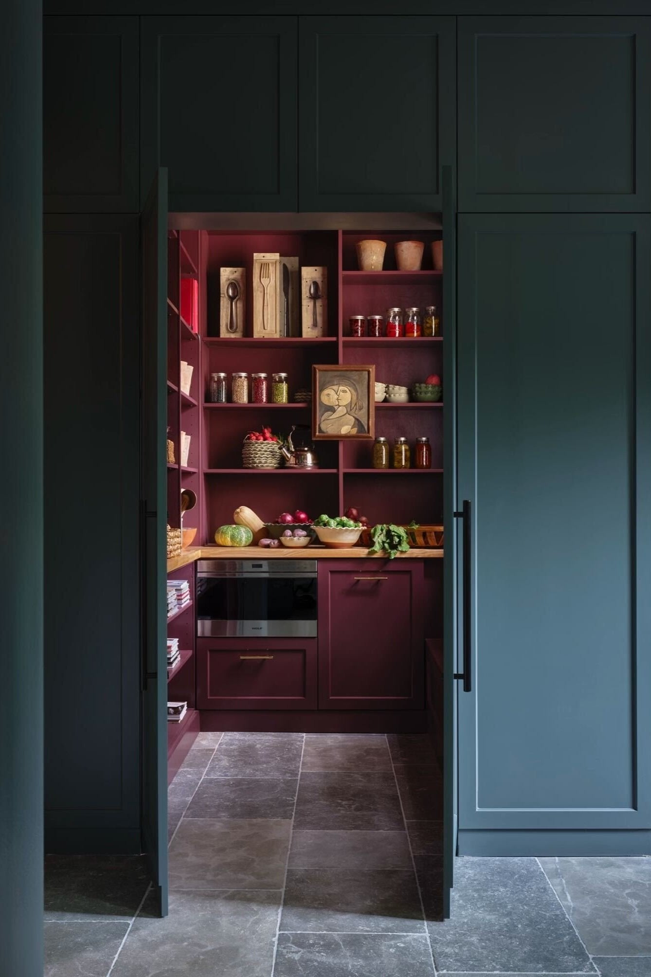 Aesthetically, we were inspired by two Black Forest wall hangings we had fallen in love with. We bought them before we had a home for them, knowing they would be the jumping-off point for an incredible space. We had them turned into sconces and allowed their intricate, moody shape to inform the feel of the room. We painted the cabinetry a polished mossy green to play off the rustic carved wood of the scones and the raw materiality of the blue stone floors we installed. For an expected moment of excitement, opening the pantry reveals a lush raspberry cocoon.