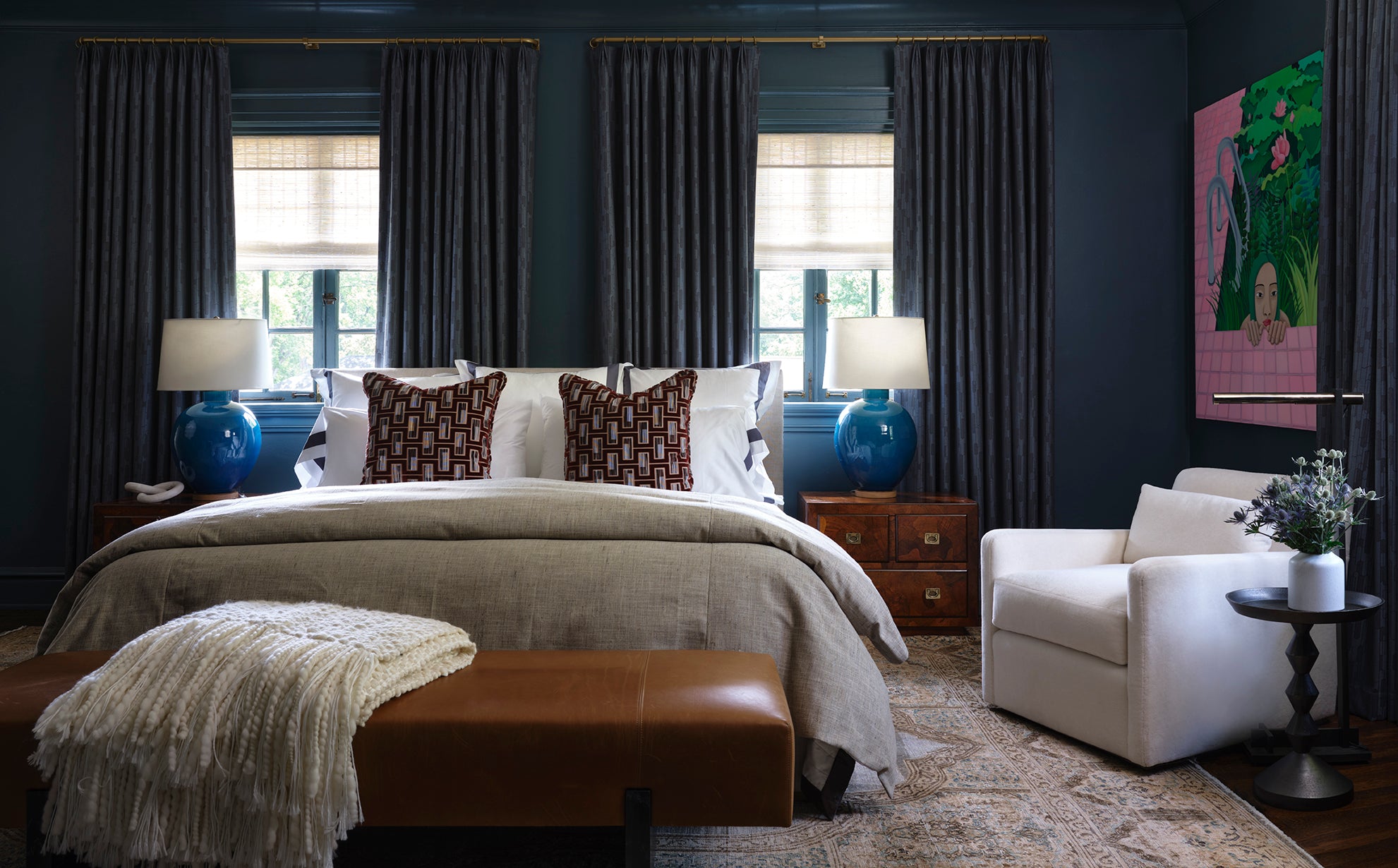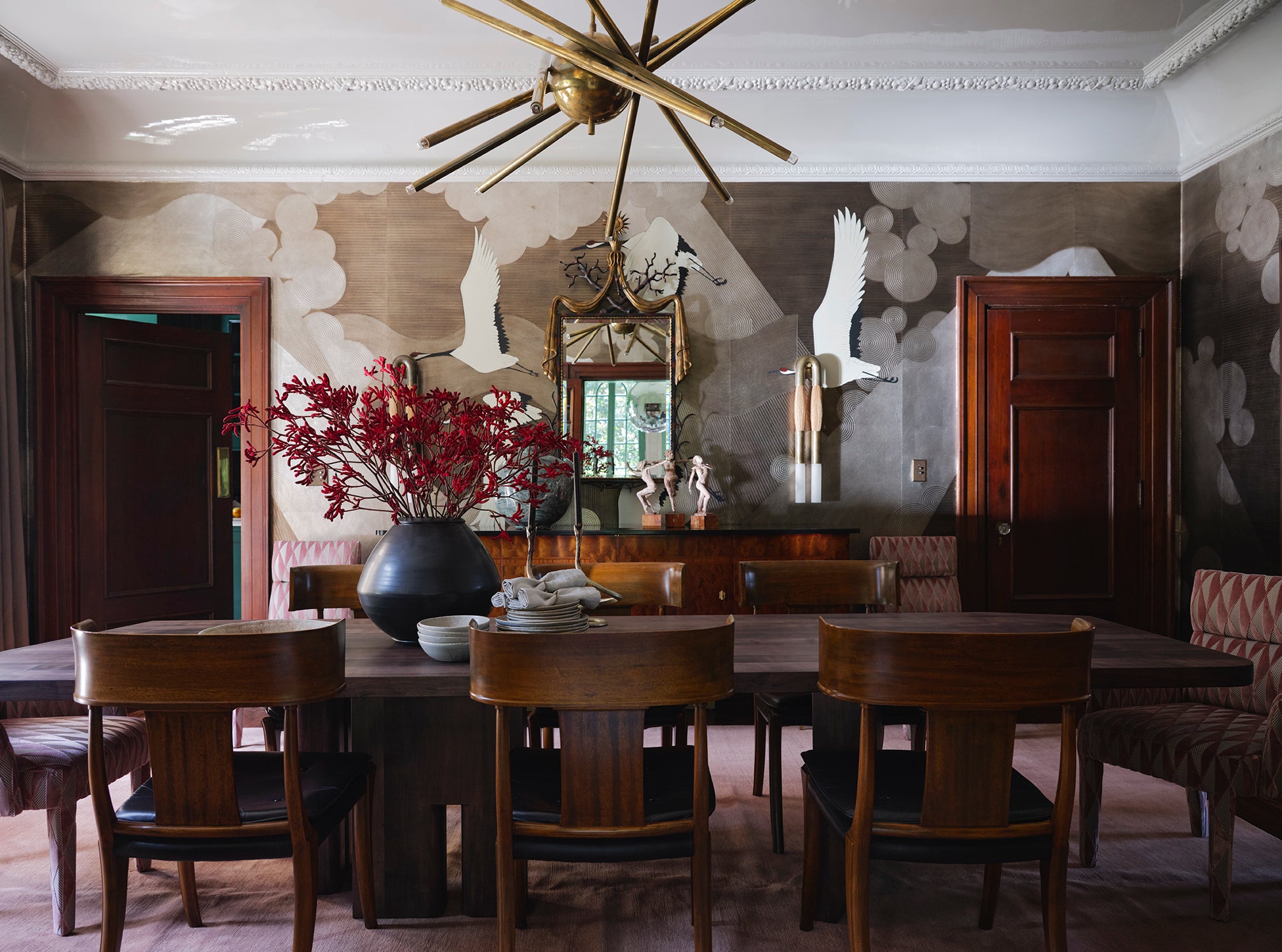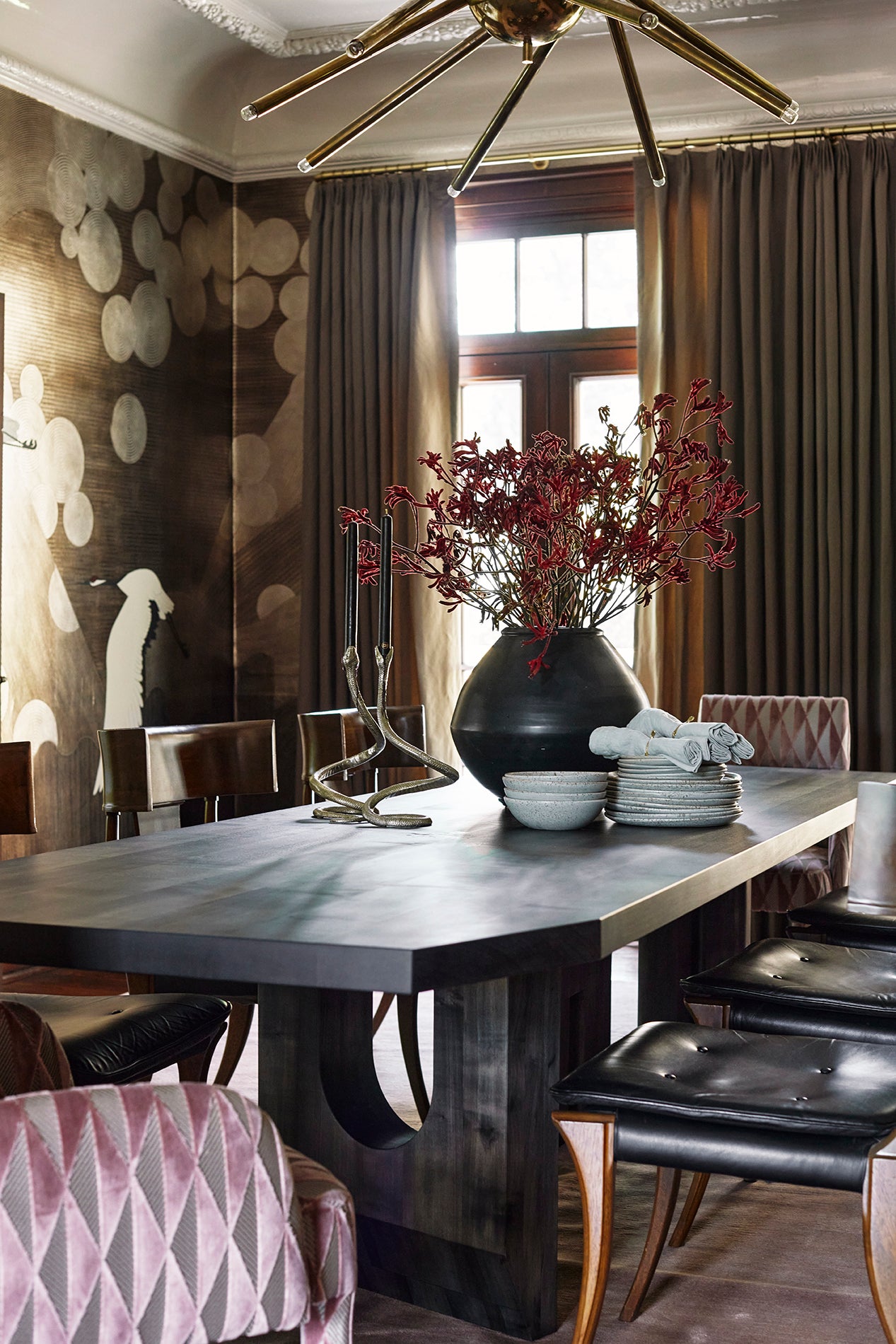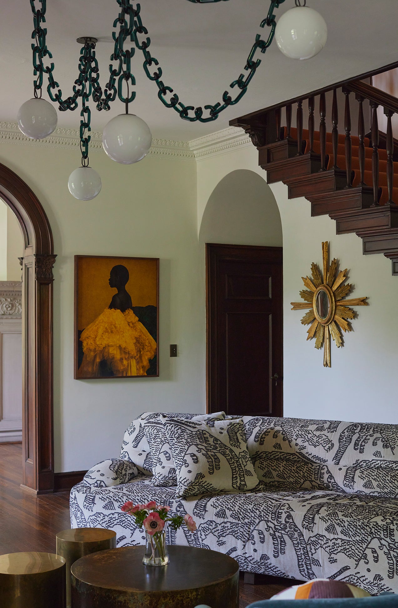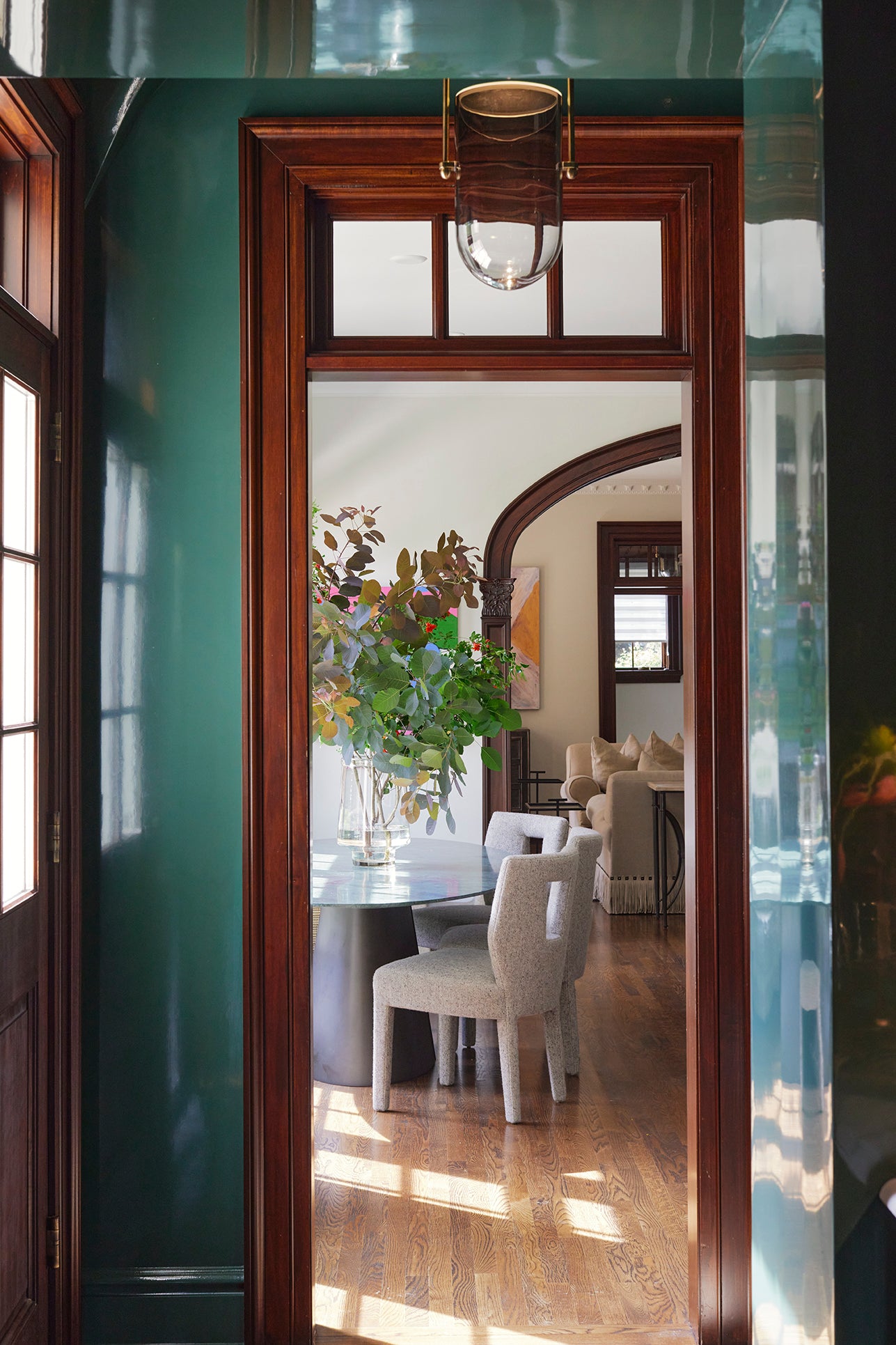 Taking a progressive approach to the home, entertaining became the intention of the front of the home. With a focus on exceptional aesthetic moments - from the custom glass-blown chain light fixture to the hand-painted de Gournay wallpaper - we created an environment ripe for the merriment of hosting and the appreciation of beauty. The private spaces of the home became a relaxing respite for a young family, together creating a home ideal for modern life.